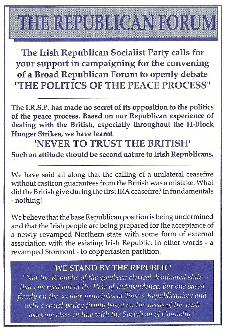 The leaflet also illustrates the role Christy Burke played in Sinn Fein at the time. Amongst other things it mentions that he stood in the 1996 Forum elections.