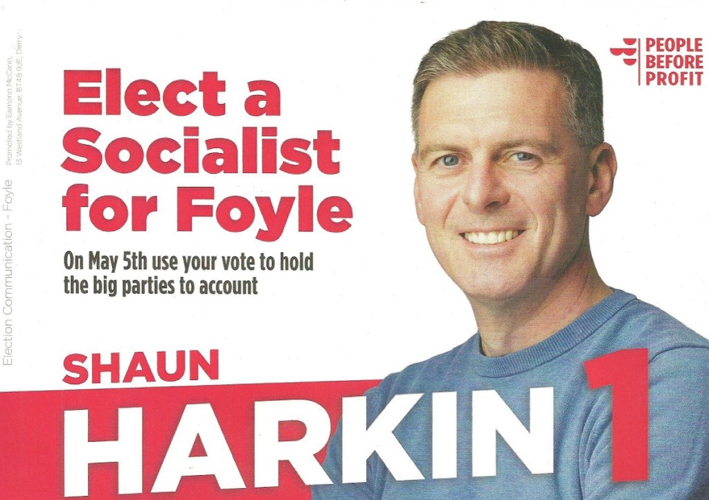 From the 2022 Assembly Elections , a leaflet from Shaun Harkin who is running for People Before Profit in Foyle. Many thanks to the sender.