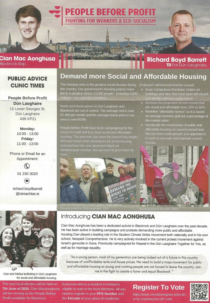 A leaflet from Cian Mac Aonghusa who is running for People Before Profit in Blackrock in the 2024 Local Elections. His Grandfather Proinsias Mac Aonghusa , ran as an Independent in Dun Laoghaire Rathdown in 1969 (leaflet to appear after the local/ European elections).