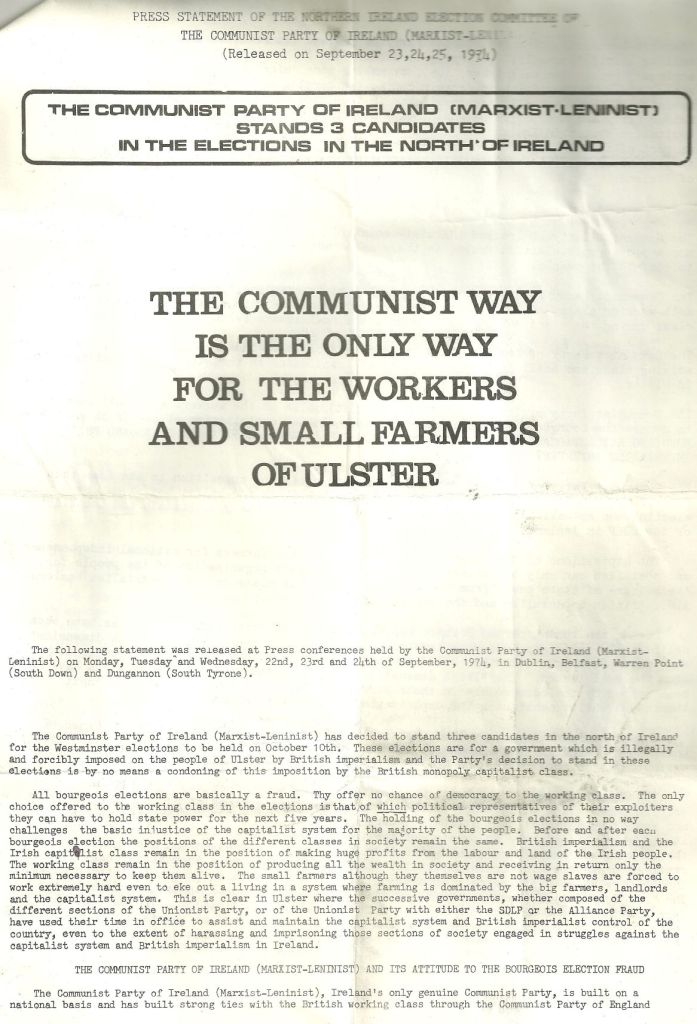 A Six page Press Statement from the Communist Party of Ireland (Marxist Leninist) on standing 3 candidates in the October 1974 UK Election. The candidates were David Vipond who polled 154 votes in South Down, Peter Kerins who polled 203 votes in West Belfast and Alan Evans who polled 185 votes in Fermanagh South Tyrone. I’ve uploaded it in pdf