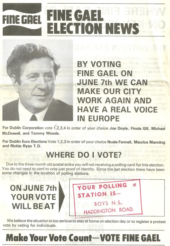 From the 1979 Local and European Elections “Fine Gael Election News” for Dublin Area Number 10. It covers local and National issues. The candidates in the Locals were Michael McDowell, Joe Doyle, Finola Gill and Tommy Woods and Joe Doyle was elected. The European candidates were Richie Ryan, Nuala Fennell and Maurice Manning and Ryan was elected.
