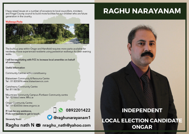A Leaflet from Raghu Narayanam who is running as an Independent in Ongar for a seat on Fingal County Council.