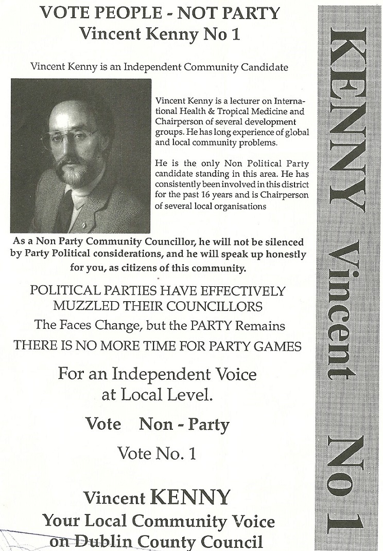 From the 1991 Local Elections a Leaflet from Vincent Kenny who was running as an Independent in Rathfarnham. He polled 760 votes and missed out on a seat.