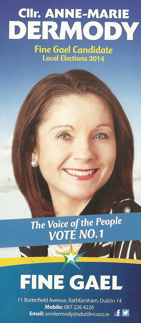 Leaflet from Anne-Marie Dermody -Fine Gael -Rathfarnham -2014 Local Elections January 9, 2014