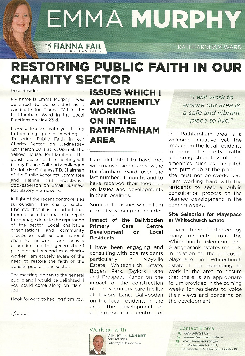“Restoring Public Faith in Our Charity Sector” Leaflet and Meeting Notice from Emma Murphy -Fianna Fail -Rathfarnham March 9, 2014