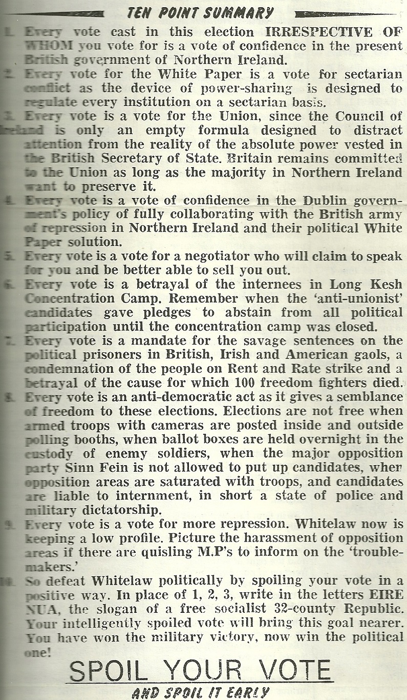 From an “Evening Edition” of Republican News dated the 27th of June 1973 a ‘Ten Point Summary’ as to why Repubicans should spoil their vote in the Northern Ireland Assembly Elections which took place the following day.