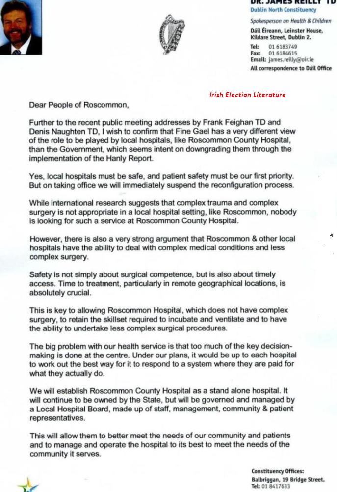 From the 2011 General Election a letter from the then Fine Gael Health spokesperson (and now Minister of Health) Dr James Reilly to the “People of Roscommon” with assurances over Roscommon Hospital.