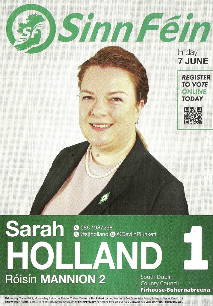 A Leaflet from Cllr Sarah Holland of Sinn Féin who is running in the Firhouse-Bohernabreena LEA to retain her seat on South Dublin County Council.