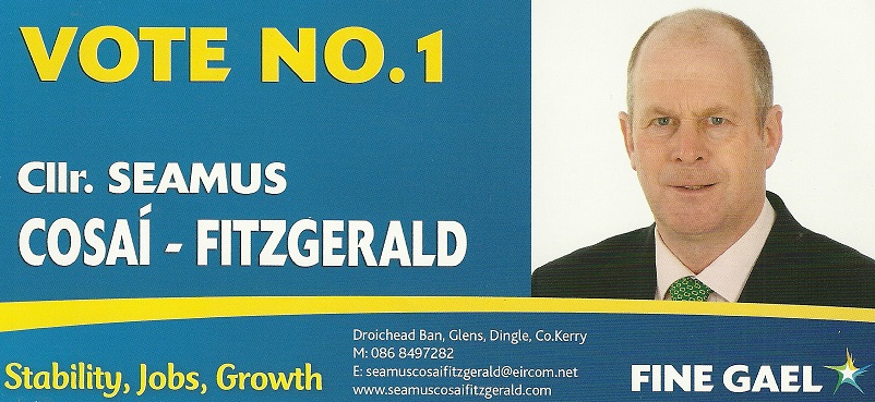 A Canvass Card from Seamus Cosaí-Fitzgerald who is running for Fine Gael in South and West Kerry for a seat on Kerry County Council.