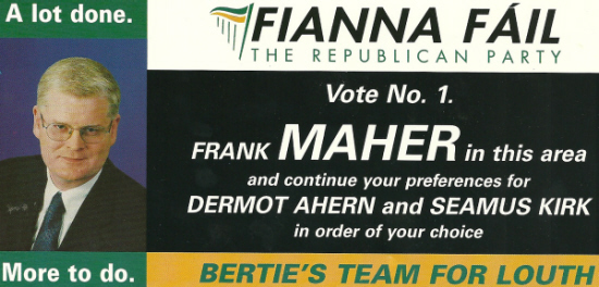 A leaflet from the 2002 General Election for Fianna Fail candidate in Louth Frank Maher. Drogheda based Maher polled 4,653 votes and narrowly missed out on a seat. He stood again in the 2007 General Election without success.