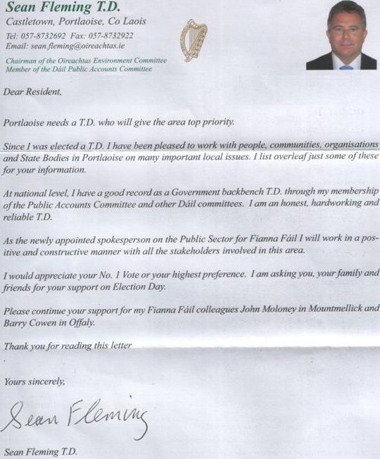 “Portlaoise needs a TD who will give the area top priority”- Letter from Sean Fleming- Fianna Fail- Laois Offaly February 23, 2011