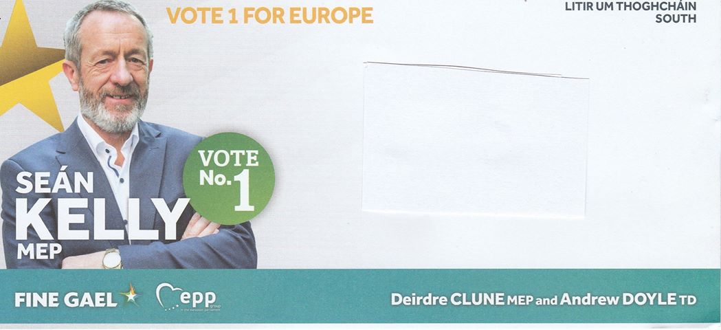 A Leaflet from Seán Kelly of Fine Gael who is running in the Ireland South constituency in the European Elections.