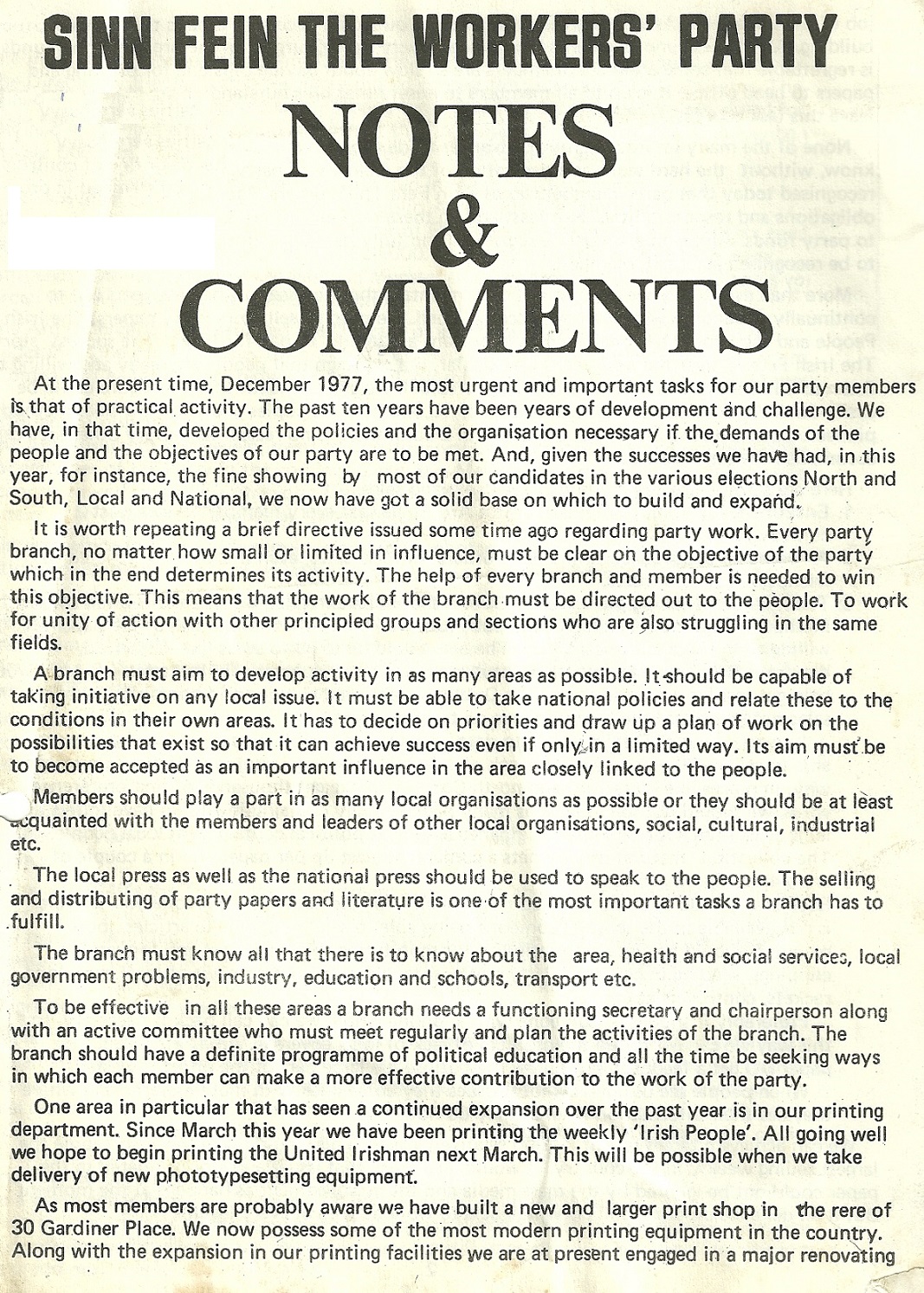From December 1977 -Sinn Fein The Workers Party ‘Notes & Comments’ May 29, 2013