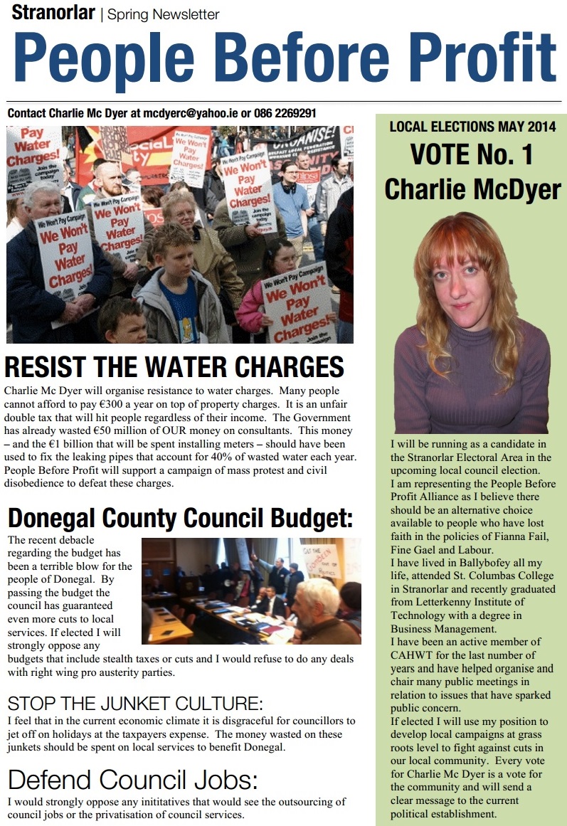 A leaflet from Charlie McDyer who is running for People Before Profit in Stranorlar for a seat on Donegal County Council.