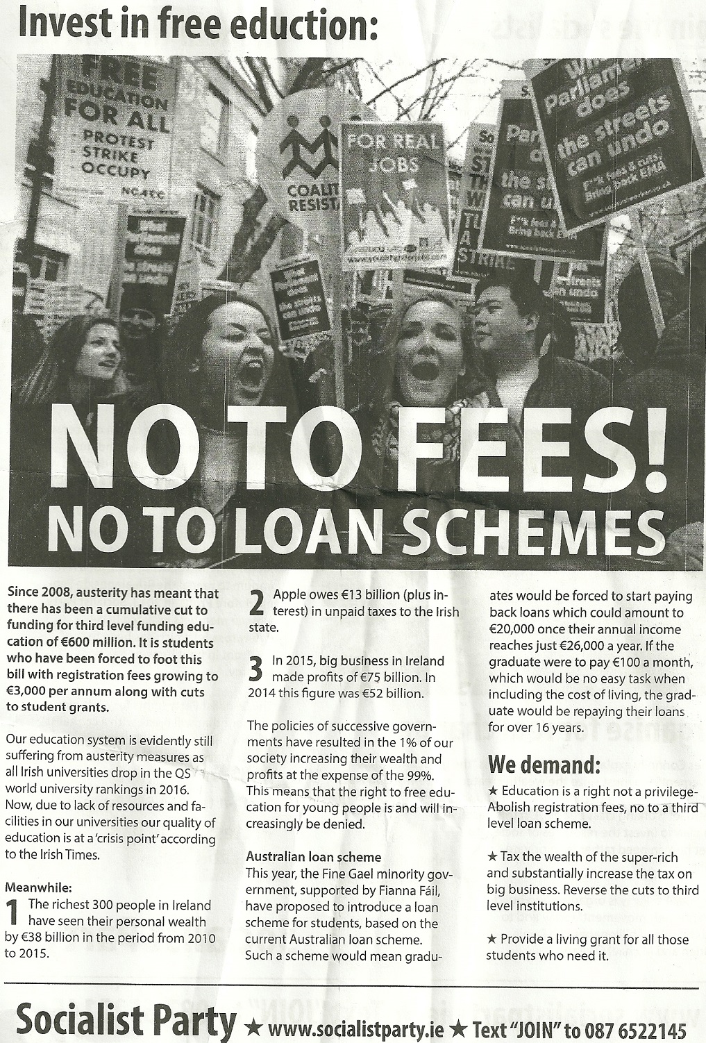 A “No To Fees! No To Loan Schemes” leaflet from The Socialist Party which also covers wider issues such as Repealing the 8th.
