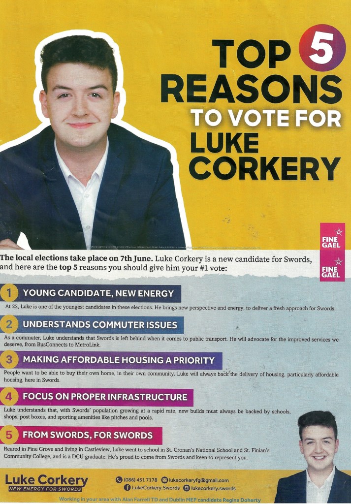 A “Top 5 reasons to vote for Luke Corkery” leaflet. Luke Corkery is running for Fine Gael in Swords in the 2024 Local Elections.