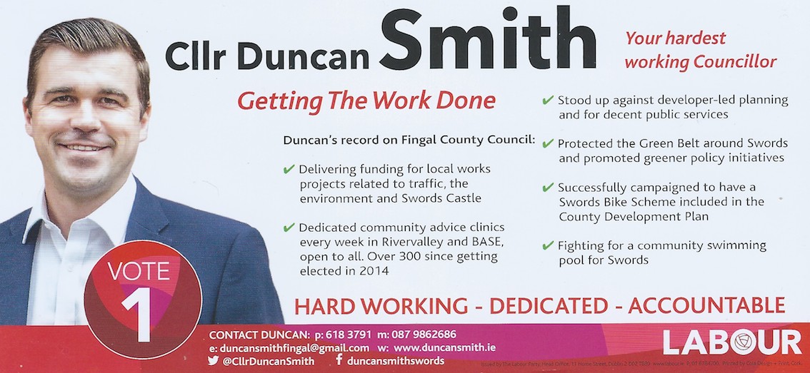 A flyer from Duncan Smith who is running for The Labour Party in Swords for a seat on Fingal County Council.