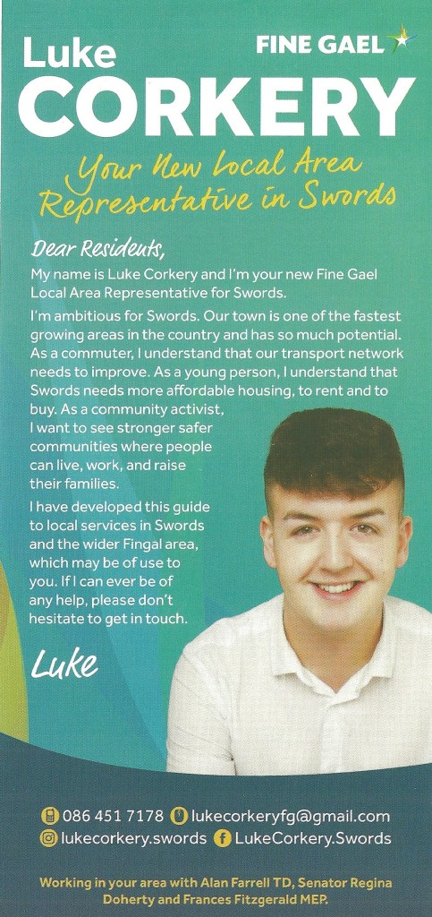 A “Top 5 reasons to vote for Luke Corkery” leaflet. Luke Corkery is running for Fine Gael in Swords in the 2024 Local Elections.