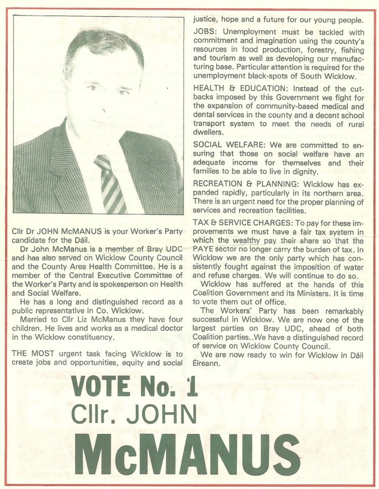 From the 1987 General Election a leaflet for John McManus of The Workers’ Party running in Wicklow. He polled 3,509 votes and missed out on a seat.
