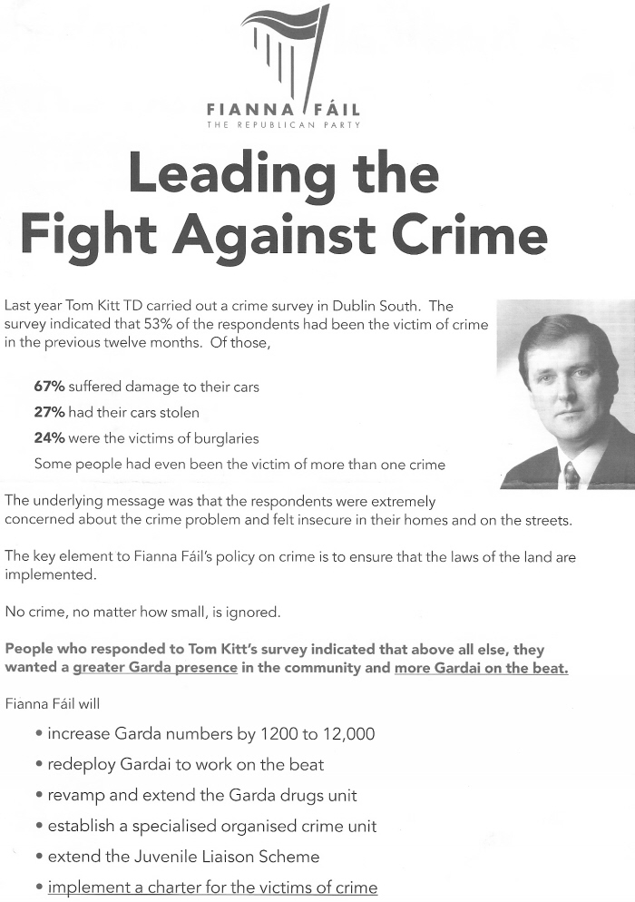 ‘Fianna Fails policy on crime is to ensure that the laws of the land are implemented’ -Tom Kitt leaflet -Fianna Fail 1997 General Election Dublin South October 18, 2010