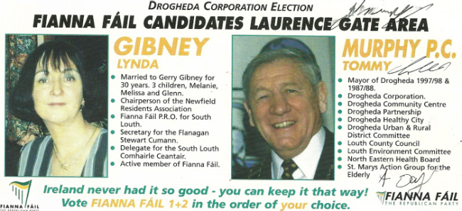 from the 1999 Local Elections a flyer for Fianna Fail candidates Lynda Gibney and Tommy Murphy running for Drogheda Corporation. Tommy Murphy was elected.