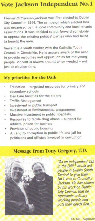 from the 1989 General Election a leaflet from Independent TD Tony Gregory who was running in the then five seat Dublin Central. He was elected on the first count.