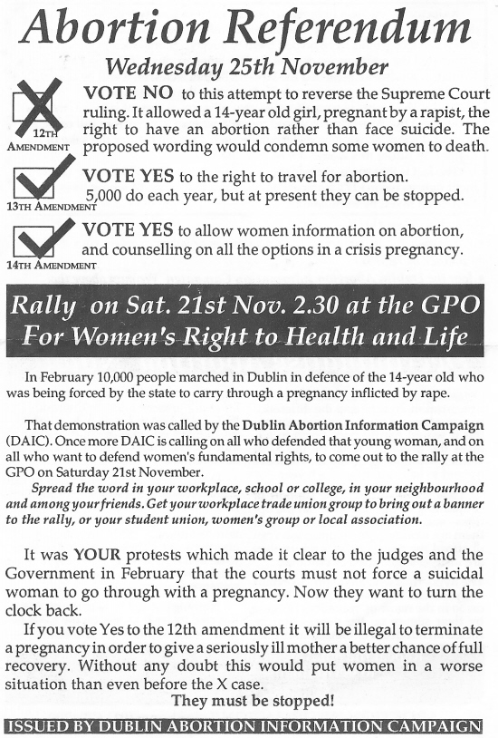 From the 1992 Abortion Referendum a leaflet produced by the Dublin Abortion Information Campaign.
